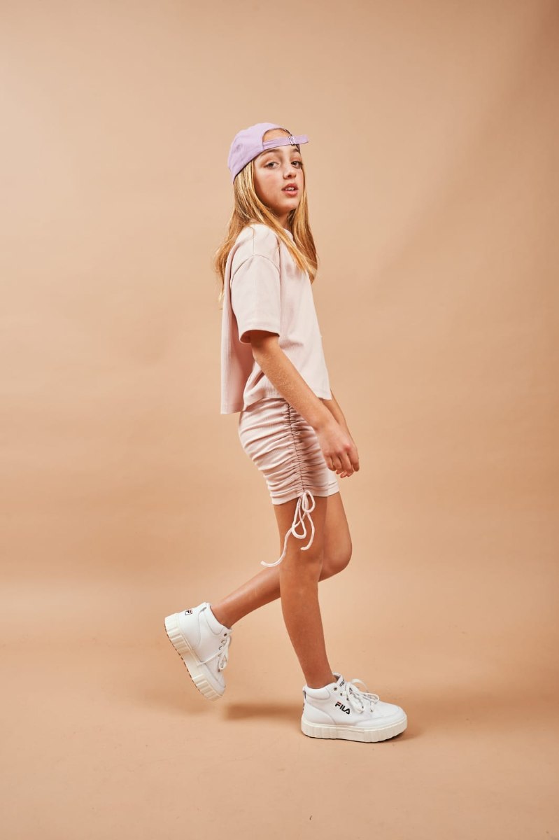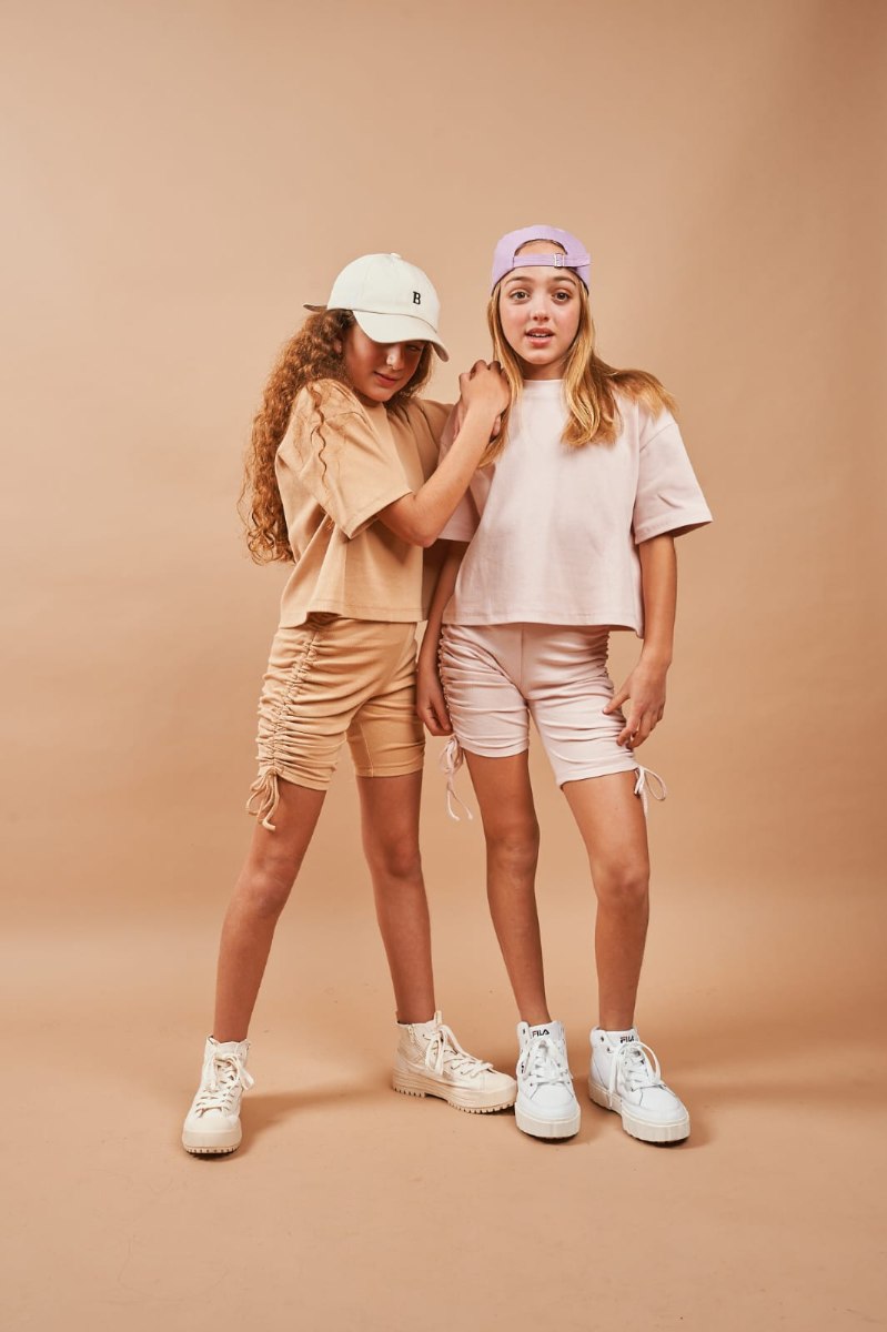 חליפת טייץ באורך ברך עם שרוך לכיווץ בצדדים, חולצת טישירט קצרה ורחבה מגיעה במידות 4-14