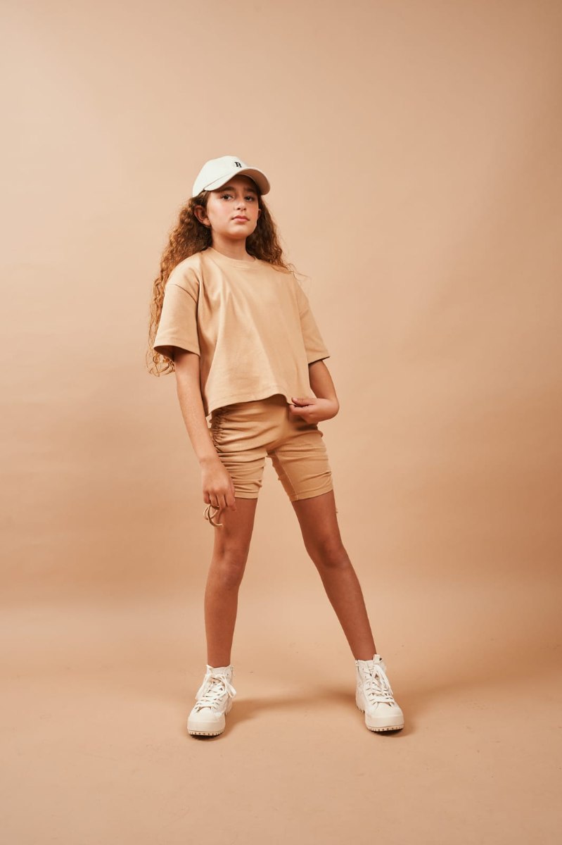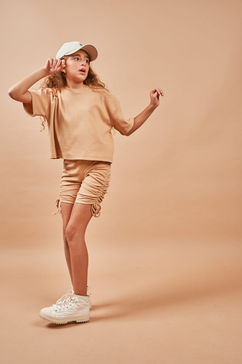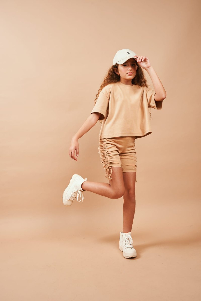 חליפת טייץ באורך ברך עם שרוך לכיווץ בצדדים, חולצת טישירט קצרה ורחבה מגיעה במידות 4-14