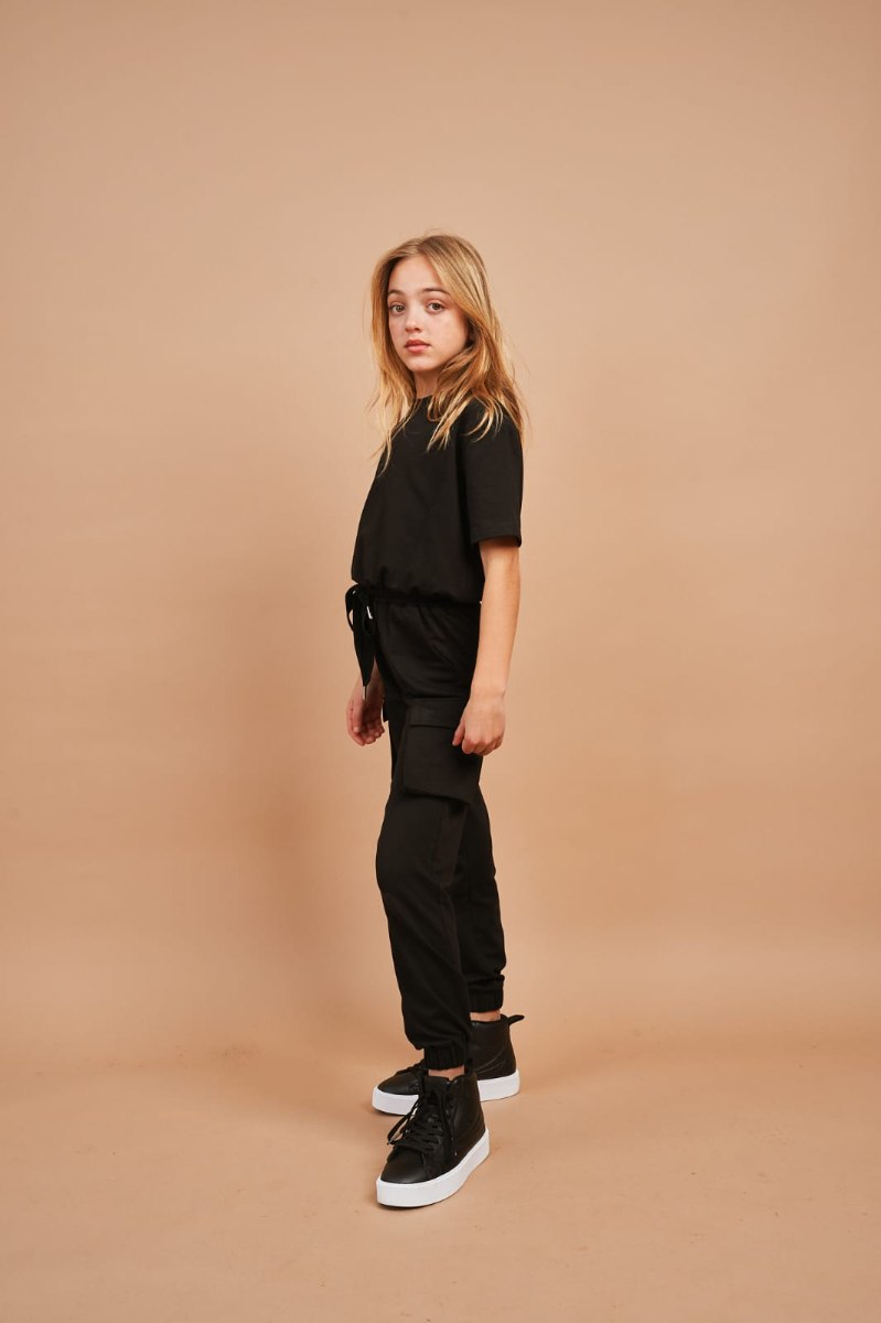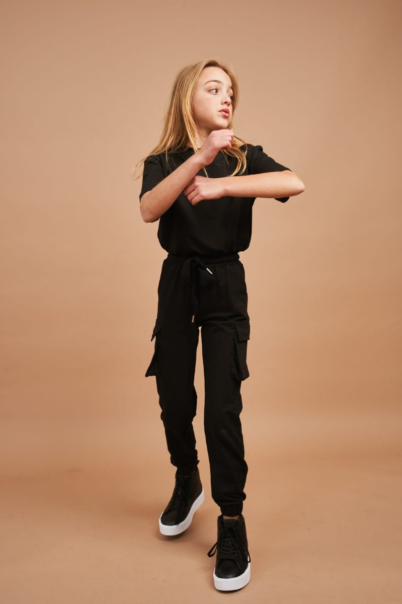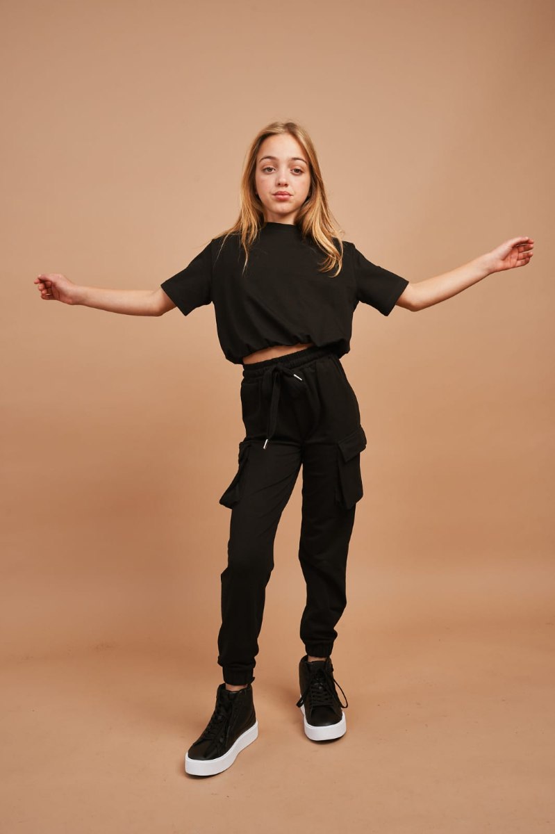 חליפה ספוטיבית, מכנס פוטר דק בגזרת דגמ"ח, שני כיסים בצדדים, גומי במותן ושרוך להידוק, חולצה קצרה עם גומי במותן. מגיעה במידות 4-14