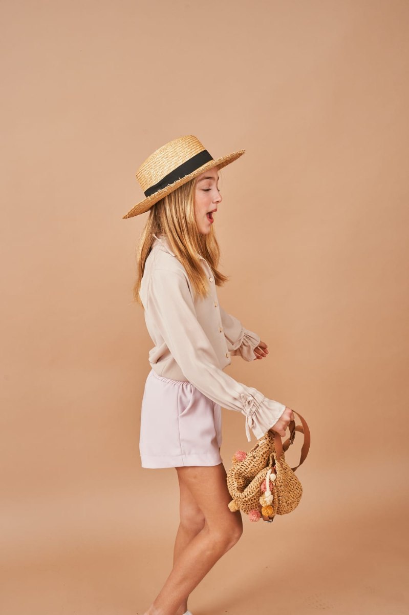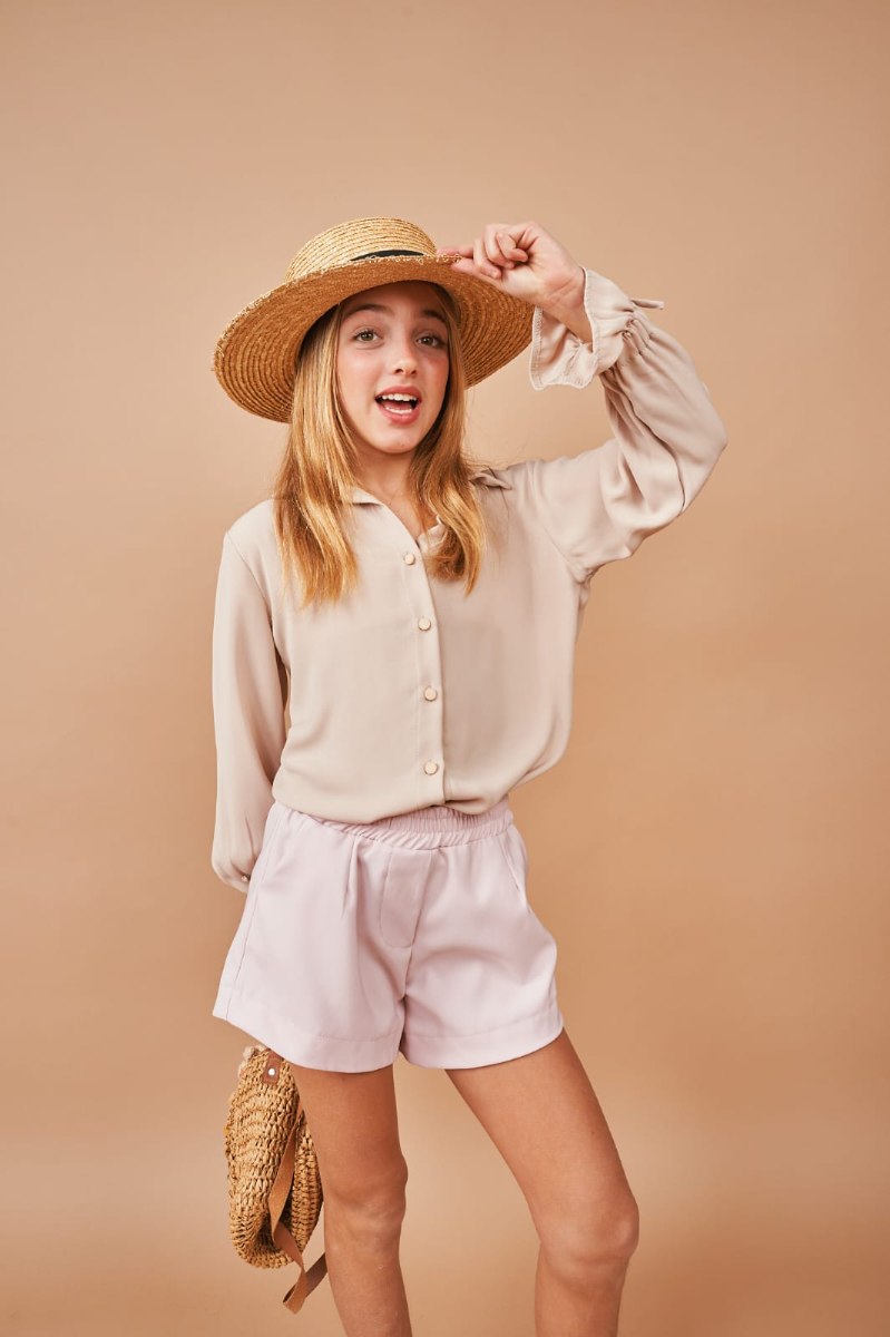 חליפת חולצת עם כפתורים נסתרים ומכנסון, שרוול בסיומת סרט להידוק, מכנס קצר עם גומי במותן וכיסים מגיעה במידות 4-14
